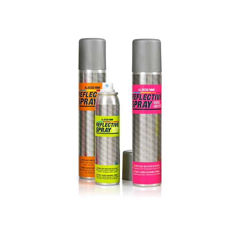 Albedo 100 Spray Reflectante es una serie de tres diferentes sprays con un efecto reflectante de la luz que hace los objetos visibles en condiciones de poca luz como el anochecer y la oscuridad.